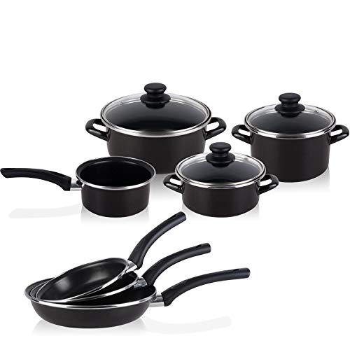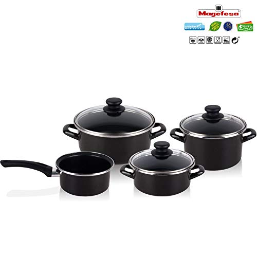 Magefesa – Bateria de cocina 7 piezas + Set Juego 3 Sartenes 18-20-24 cm, antiadherente libre de PFOA, limpieza lavavajillas apta cocinas, vitroceramica, gas, fabricadas en España