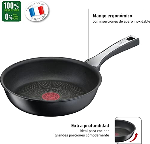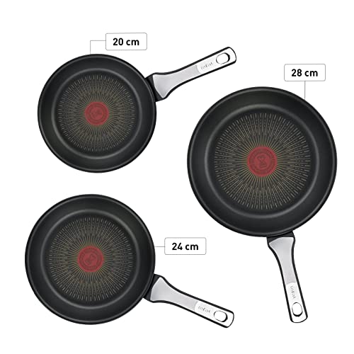 Juego 3 de sartenes de 20-24 y 28 cm con revestimiento antiadherente de alta calidad que dura hasta 6 veces más que el revestimiento de titanio estándar de Tefal, y resistente gracias a su estructura muy reforzada y a su capa protectora enriquecida con titanio